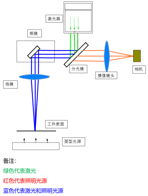 ①、工件表面上的特征信息依次經(jīng)過場鏡、振鏡,并透過分光鏡,經(jīng)過攝像鏡頭成實像至相機上;